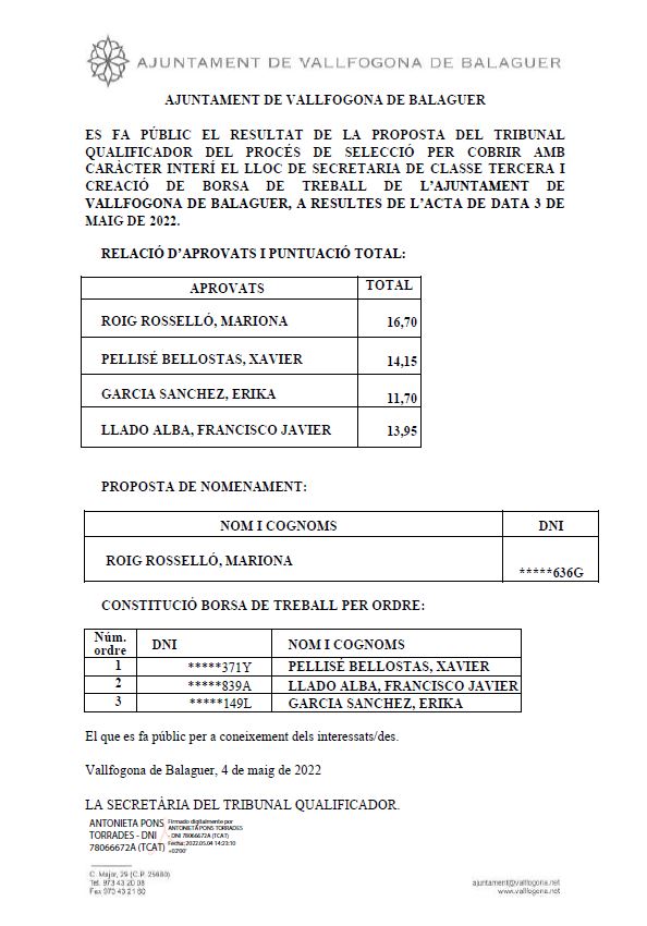 Ets aquí: Inici1 / Històric publicacions2 / CONVOCATÒRIA PROCÉS DE SELECCIÓ DE LA PLAÇA DE SECRETARIA INTERVENCIÓ...
